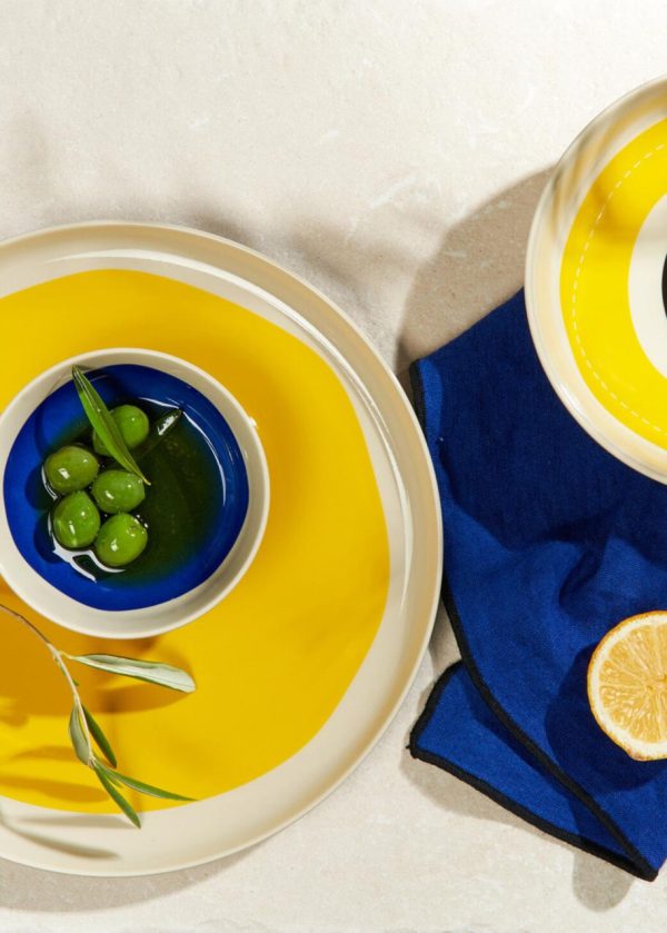 Inspiré par le soleil du sud et le bleu de la mer, cette vaisselle joue avec les formes et les motifs. Faite à la main, chaque pièce est unique. Lavable au lave-vaisselle, adapté au micro-ondes, au congélateur et au four.