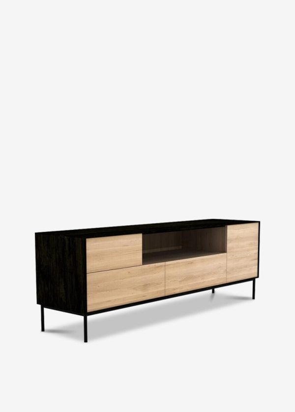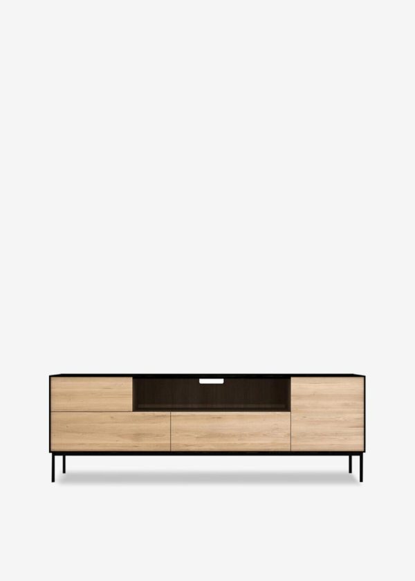 Au sein des collections Whitebird et Blackbird, le designer Alain van Havre propose aussi un meuble Tv très fonctionnel. Très graphique, ce meuble aux lignes épurées joue sur les contrastes entre un corps en chêne massif et un piètement tubulaire métallique. Doté de nombreux rangements, il vous permettra grâce à son étagère centrale d’installer aisément vos utilitaires périphériques grâce au passe-câbles ou vos grands livres d’art. Dans un souci de beauté authentique, le bois sélectionné au sein de forêts européennes peut contenir des noeuds et des fissures naturelles qui font de chaque meuble une pièce unique. Disponible en plusieurs finitions.