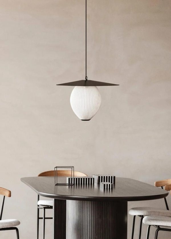 Inspirées d’une lanterne asiatique, les suspensions Satellite dessinées en 1953 sont les premiers luminaires conçus à partir de tôle micro perforée : la « Rigitulle », aussi fine que de la dentelle, que le designer a utilisée dans la majorité de ses oeuvres. La lumière est filtrée au travers d’une multitude de trous du diffuseur oblongue, ce qui engendre des jeux d’ombres capti¬vants qui confèrent à la suspension son caractère insolite.